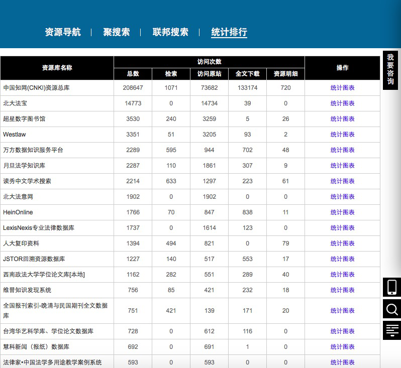 總排行表將顯示資源庫的名稱(chēng)、總訪(fǎng)問(wèn)量、訪(fǎng)問(wèn)入口量、檢索量、瀏覽量、下載量。每列數據都可以點(diǎn)擊標題排序,默認按總訪(fǎng)問(wèn)量排名。需要注意:如果在所選擇的時(shí)間范圍內,某資源庫沒(méi)有被訪(fǎng)問(wèn)過(guò),那么這里的排行表中不會(huì )顯示該資源庫。
