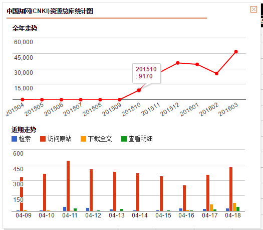 包括總體的訪(fǎng)問(wèn)量情況,登錄過(guò)多少次,每一次登錄的時(shí)間、使用設備、IP地址,每次登錄訪(fǎng)問(wèn)的資源庫情況,每次下載全文的文章,瀏覽電子資源庫的情況,檢索的次數和檢索詞等等。需要了解用戶(hù)行為時(shí),選擇相應的日期即可。
