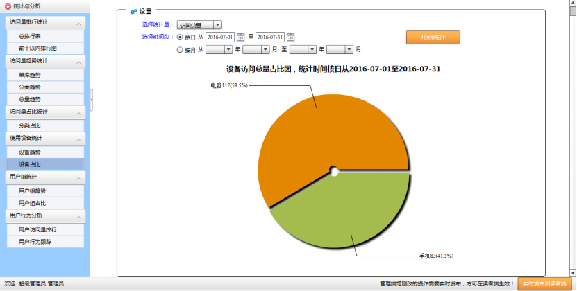 點(diǎn)擊菜單【統計與分析>>使用設備統計>>設備占比】,打開(kāi)設備占比圖的設置頁(yè)面。查看不同設備訪(fǎng)問(wèn)量的占比時(shí),選擇相應的時(shí)間段即可統計,默認統計數據為訪(fǎng)問(wèn)總量,可以切換不同的訪(fǎng)問(wèn)類(lèi)型了解不同的設備的操作行為占比情況(如下圖)。