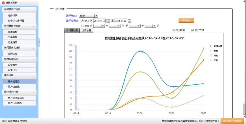 點(diǎn)擊菜單【統計與分析>>用戶(hù)組統計>>用戶(hù)組趨勢】,打開(kāi)用戶(hù)組趨勢圖的設置頁(yè)面。查看某用戶(hù)角色的訪(fǎng)問(wèn)量趨勢需要選擇相應的角色,再選擇相應的時(shí)間段(如下圖)。
