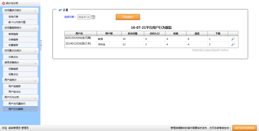 從廣義上講,用戶(hù)行為分析是一個(gè)大范疇,以上講解的所有統計都可以認為是用戶(hù)行為分析的一部分,這里的用戶(hù)行為分析主要側重在對用戶(hù)的行為跟蹤上,可以較為全面地了解每位用戶(hù)如何使用電子資源。當前有兩個(gè)統計菜單:用戶(hù)訪(fǎng)問(wèn)量排行與用戶(hù)行為跟蹤。
